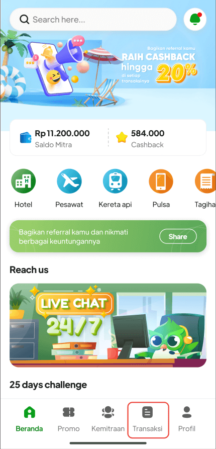 1. Masuk Pada Aplikasi HOLIGO, klik menu "**Transaksi**" pada bagian bawah aplikasi