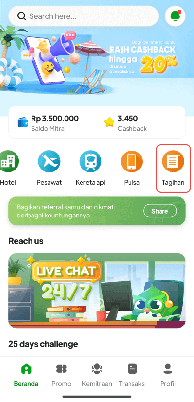 1. Login pada Aplikasi Holigo kemudian klik menu "**Tagihan**"