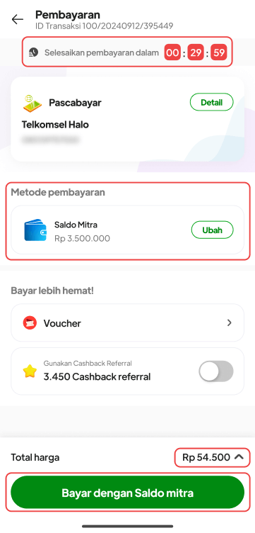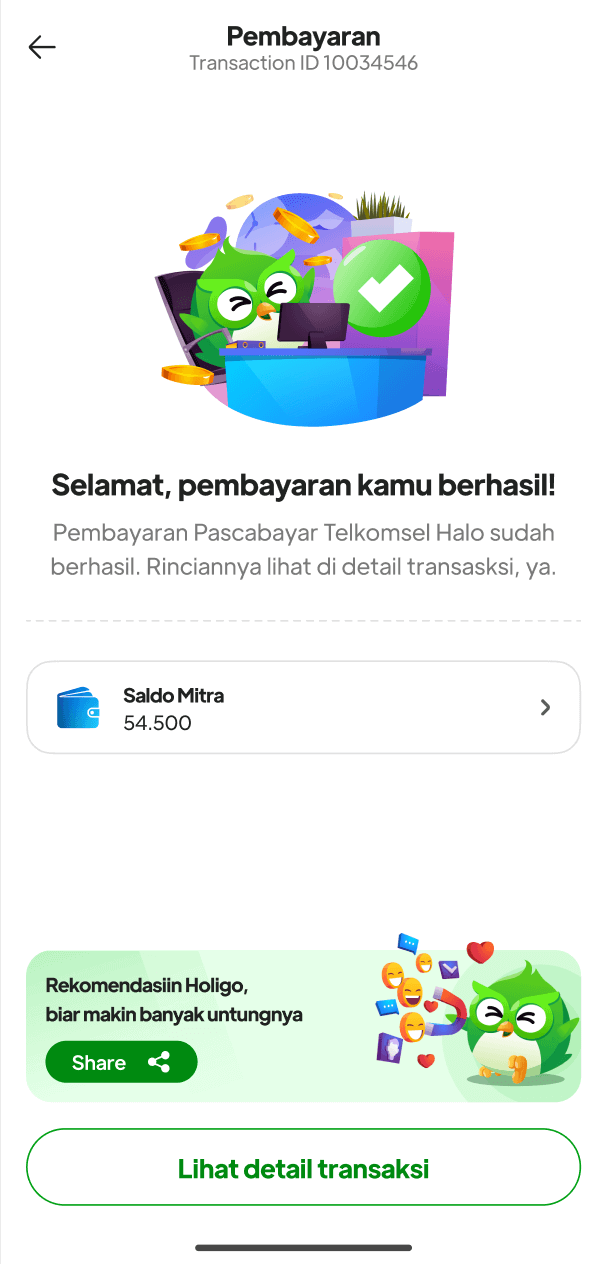 8. Akan muncul informasi bahwa pembayaran Pascabayar melalui saldo mitra sudah berhasil, tunggu 3-10 menit akan terproses oleh sistem, klik **"Lihat daftar transaksi"** untuk melihat status transaksi.